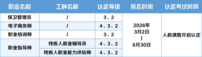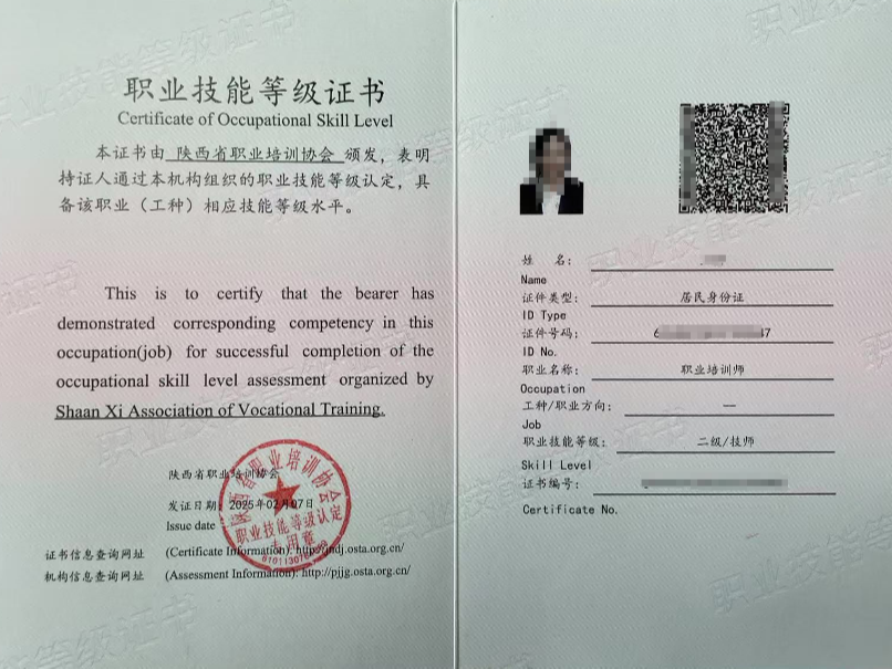 一、机构简介 陕西省职业培训协会是经西安市人力资源和社会保障局备案评估,可以对社会劳动力开展职业技能等级认定工作的认定机构,目前面向企业职工和社会劳动力开展职业技能等级评价工作。 二、证书样本及查询方式 职业技能等级证书(二级/技师)样本 职业技能等级证书(三级/高级工)样本 职业技能等级证书(四级/中级工)样本 (查询网址:http://zscx.osta.org.cn) ⬇️ 三、2026年(上半年)技能等级认定工作计划 四、申报条件 需执行陕职鉴函【2023】14号文件 1.具备以下条件之一者,可申报四级/中级工 (一)累计从事本职业或相关职业工作满5年。 (二)取得本职业或相关职业五级/初级工职业资格(职业 技能等级)证书后,累计从事本职业或相关职业工作满3年。 (三)取得本专业或相关专业的技工院校或中等及以上职业 院校、专科及以上普通高等学校毕业证书(含在读应届毕业生) 2.具备以下条件之一者,可申报三级/高级工 (二)取得本职业或相关职业四级/中级工职业资格(职业 技能等级)证书后,累计从事本职业或相关职业工作满4年。 (三)取得符合专业对应关系的初级职称(专业技术人员职 业资格)后,累计从事本职业或相关职业工作满1年。 (四)取得本专业或相关专业的技工院校高级工班及以上毕 业证书(含在读应届毕业生)。 (五)取得本职业或相关职业四级/中级工职业资格(职业 技能等级)证书,并取得高等职业学校、专科及以上普通高等学 校本专业或相关专业毕业证书(含在读应届毕业生)。 (六)取得经评估论证的高等职业学校、专科及以上普通高 等学校本专业或相关专业的毕业证书(含在读应届毕业生)。 (二)取得符合专业对应关系的初级职称(专业技术人员职 业资格)后,累计从事本职业或相关职业工作满5年,并在取得 本职业或相关职业三级/高级工职业资格(职业技能等级)证书 后,从事本职业或相关职业工作满1年。 (三)取得符合专业对应关系的中级职称(专业技术人员职 业资格)后,累计从事本职业或相关职业工作满1年。 (四)取得本职业或相关职业三级/高级工职业资格(职业 技能等级)证书的高级技工学校、技师学院毕业生,累计从事本 职业或相关职业工作满2年。 (五)取得本职业或相关职业三级/高级工职业资格(职业 技能等级)证书满2年的技师学院预备技师班、技师班学生。 报名时间:2026年3月2 日-2026年6月30日 考试时间:另行通知 公众号后台回复关键词:认定报名模板 即可收到报名表格、工龄证明及相关要求文件 五、联系方式 办公座机:029-842333001 杨老师:13060400043(同微信) 周老师:18329571851(同微信) 邮箱:3583899102@qq.com